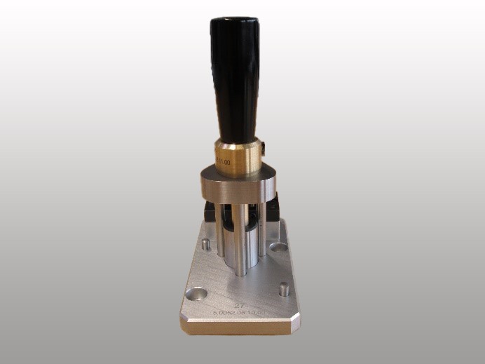 Aufnahmevorrichtung für Nockenringe. Der Nockenring wird über Magnete auf 3 Säulen gehalten. Der Messingdorn in der Mitte und die seitliche Ausrichteinheit werden nach dem Ausrichten vom Teil entfernt, um für die Messung möglichst wenige Störkonturen zu haben.